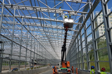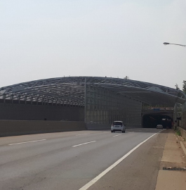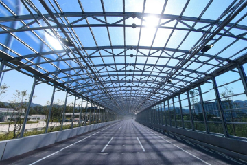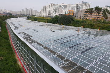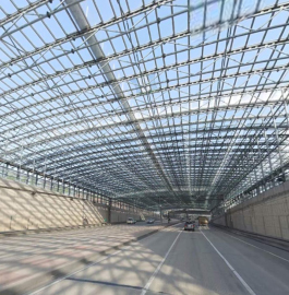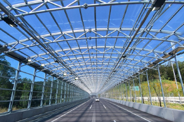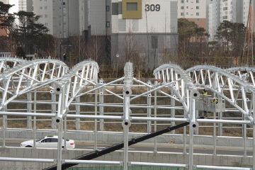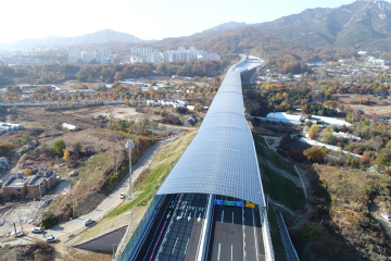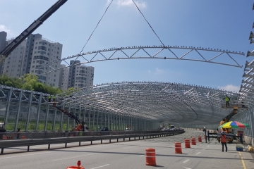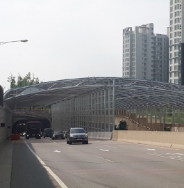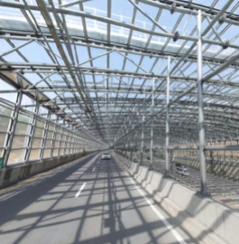 일반적인 방음터널 H-BEAM구조를 방음터널 구조물의 경량화를 위해 상부구조를 원형강관을 사용한 트러스형 구조로 적용하여 지붕부재의 변위와 하중을 최적화 하여 구조적 안전성을 향상시킨 공법 한국도로공사 기술마켓, LH 기술혁신파트너몰 등재