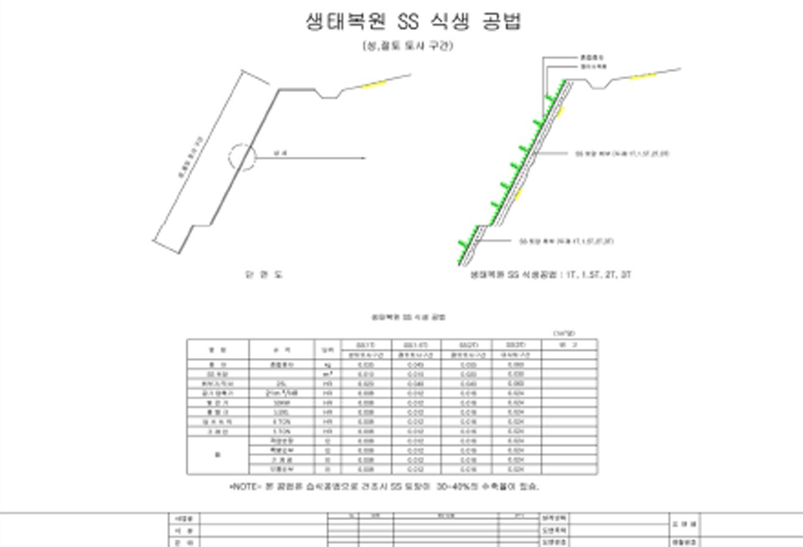 비탈면의 풍화암, 리핑암, 발파암구간에 식물착근과 발아에 좋은 유기물인 SS기반재(건식)와 SS토양(습식)을 취부하여 일반건식공법에 비해 초기발아를 극대화한 공법